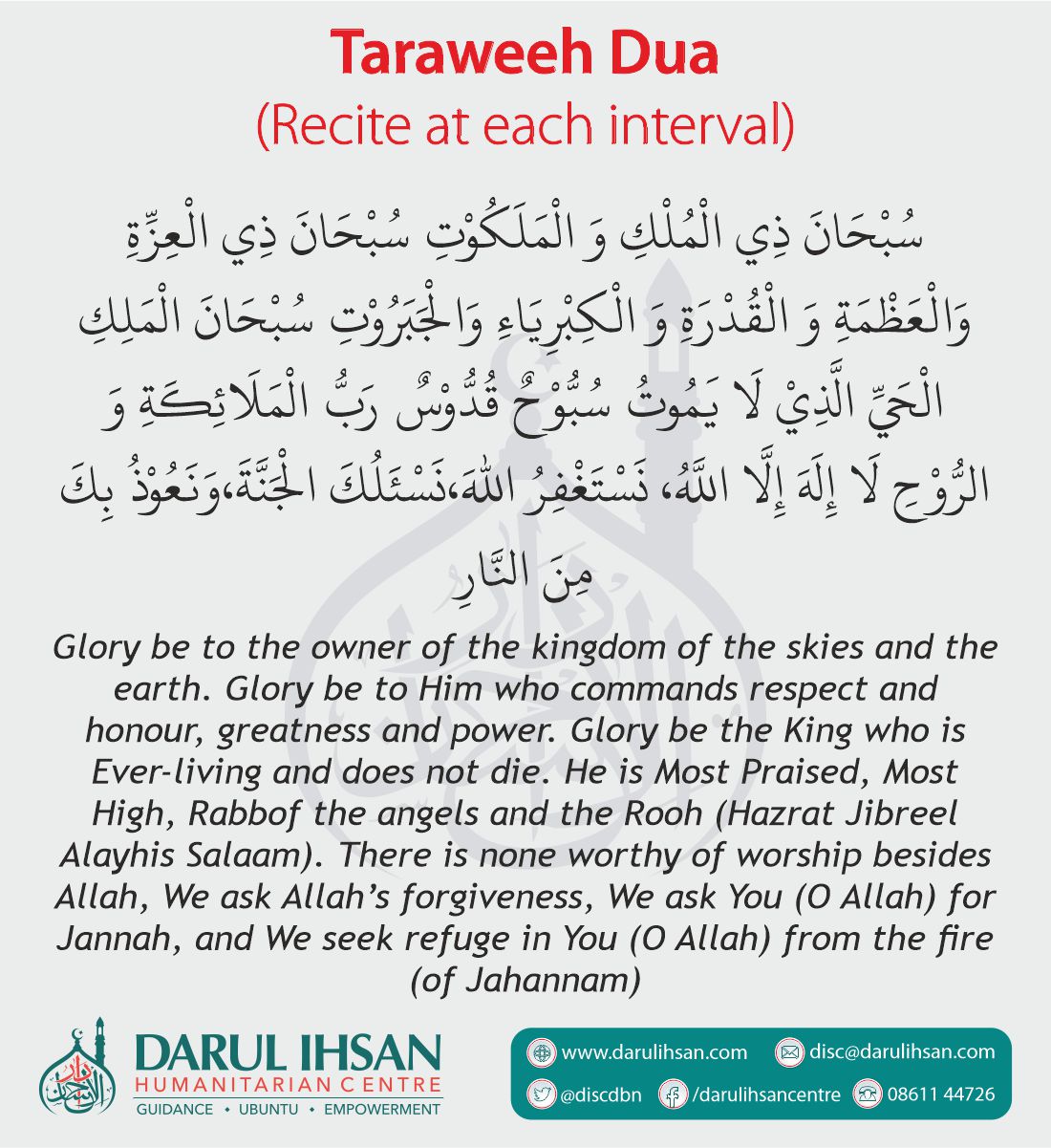 سُبْحَانَ ذِي الْمُلْكِ وَ الْمَلَكُوْتِ سُبْحَانَ ذِي الْعِزِّةِ وَالْعَظْمَةِ وَ الْقُدْرَةِ وَ الْكِبْرِيَاءِ وَالْجَبَرُوْتِ سُبْحَانَ الْمَلِكِ الْحَيِّ الَّذِيْ لَا يَمُوتُ سُبُّوْحٌ قُدُّوْسٌ رَبُّ الْمَلَائِكَةِ وَ الرُّوْحِ لَا إِلَهَ إِلَّا اللَّهُ، نَسْتَغْفِرُ اللهَ،نَسْئَلُكَ الْجَنَّةَ،وَنَعُوْذُ بِكَ مِنَ النَّارِ